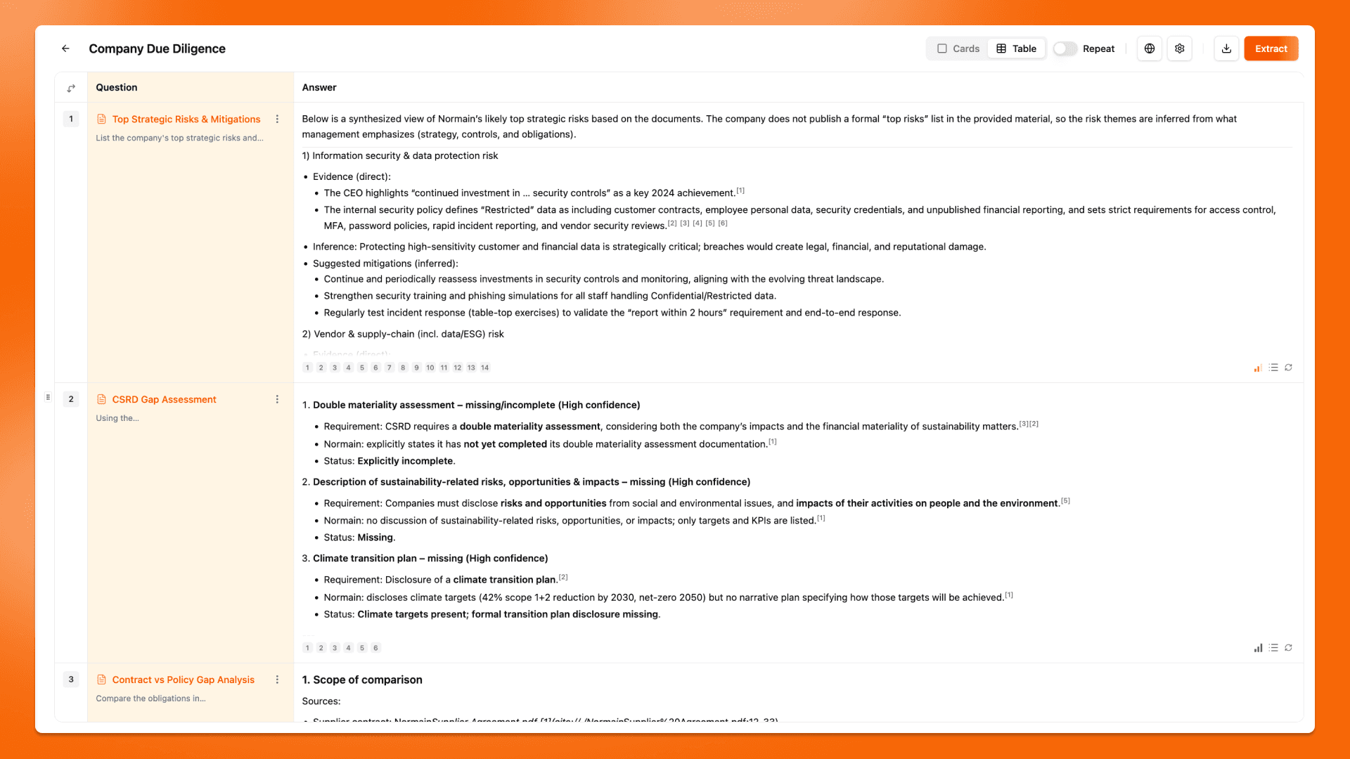 Questions can range from simpler data extraction (e.g. “What is the total revenue of the company?”) to more advanced analysis (e.g. “Compare the client’s sustainability report against CSRD requirements and list any missing disclosures, with supporting evidence.”).