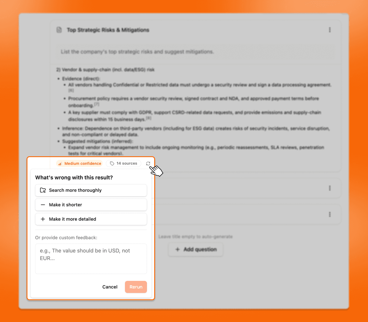 Validation tools: the ability to mark answers as correct (coming soon), provide feedback, and re-run only the specific insight, with AI support to refine prompts before regenerating